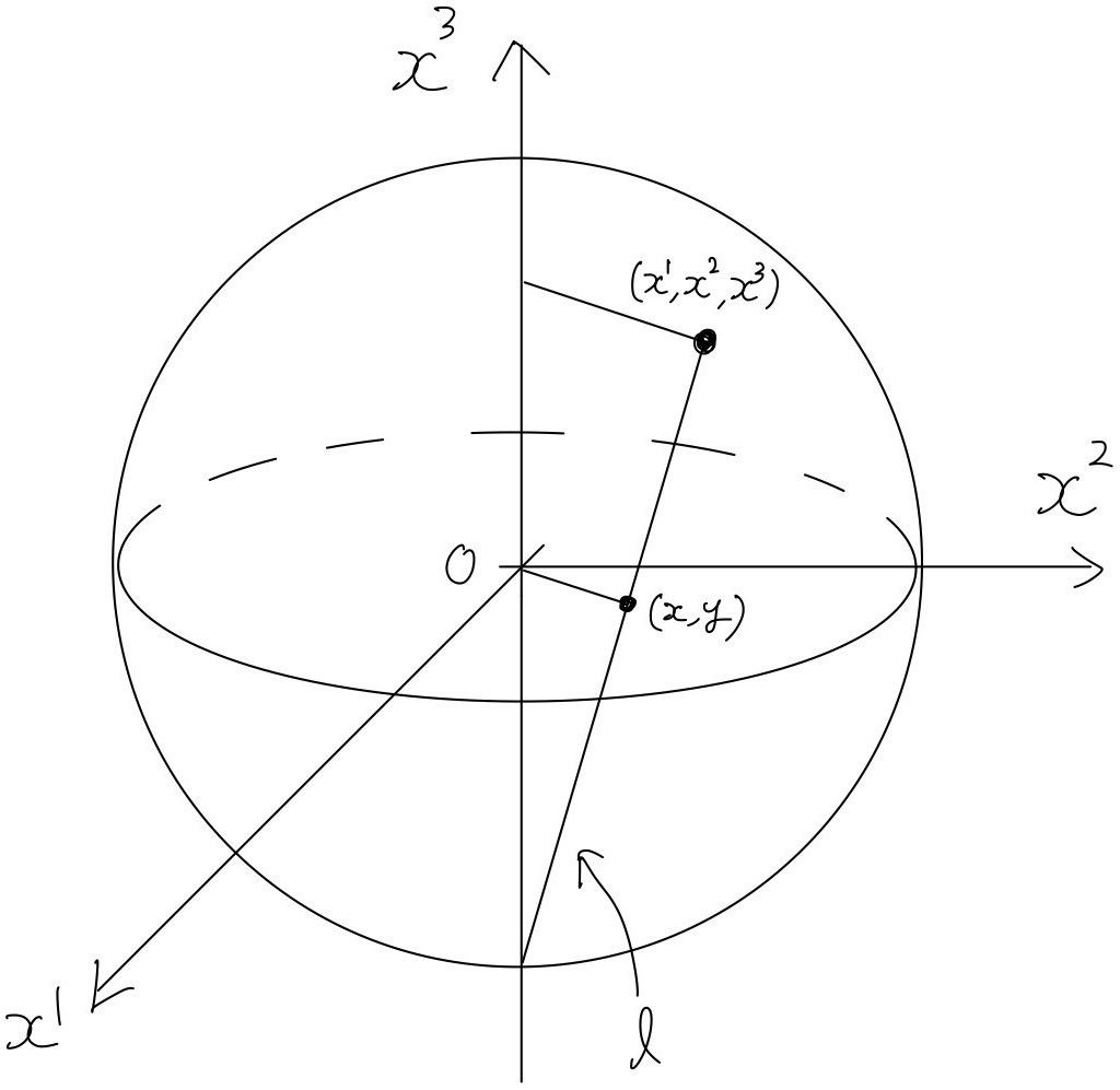 単位球が図1のように置かれているとする。単位球の南極$S=(0,0,-1)$と単位球面上の任意の点$P=(x^1,x^2,x^3)$を通る直線を$l$とし、直線$l$が$x,y$平面と交わる点の$x,y$座標を$(x,y)$とする。